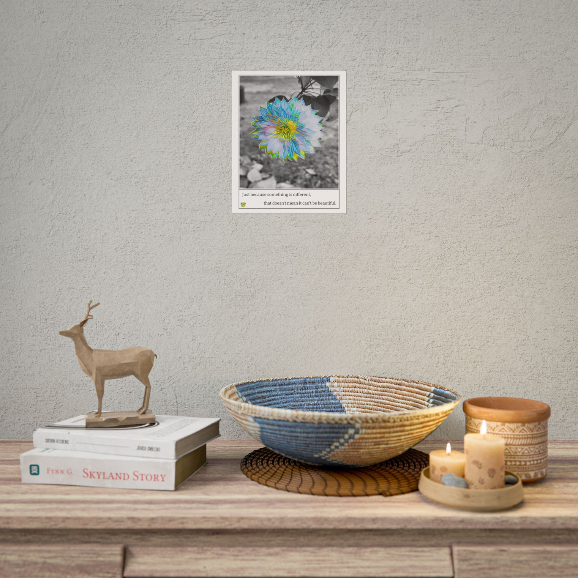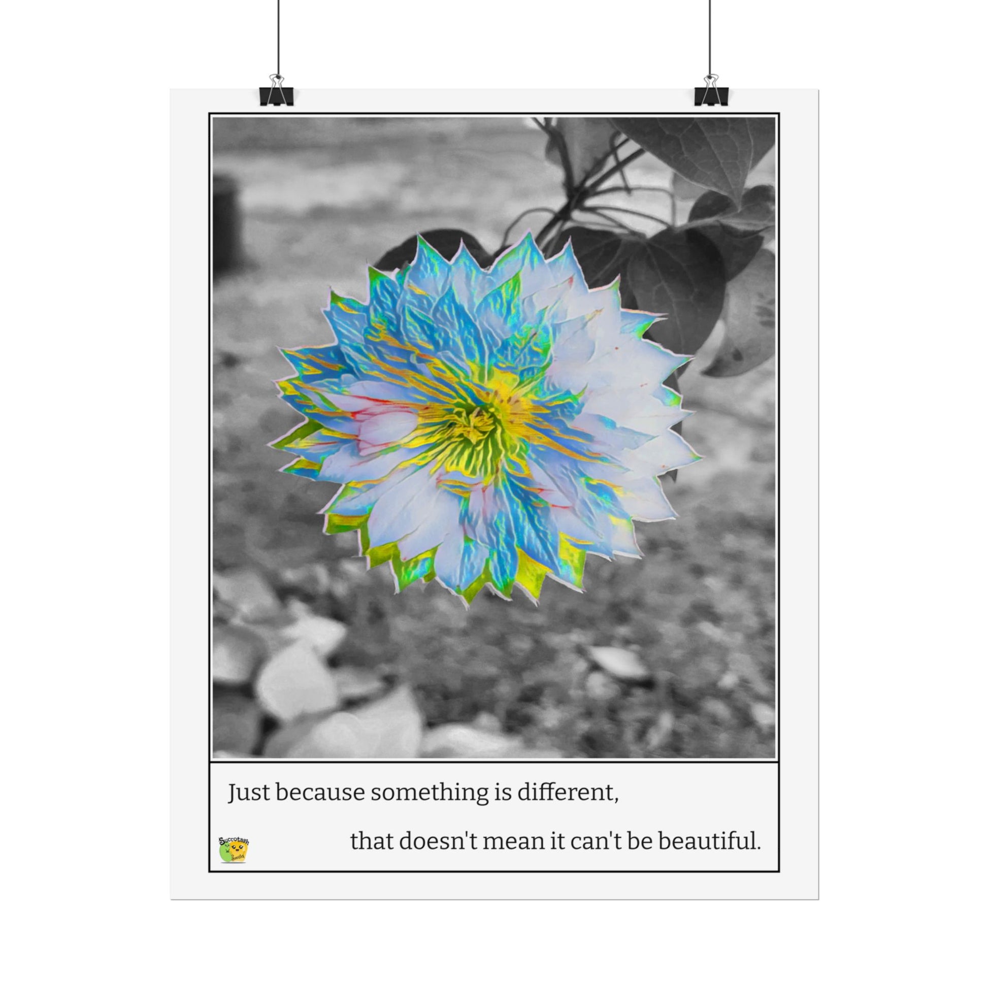 Our beautiful multicolored double clematis on a black and white background. Formatted for 8"X10" or 16"X20". With the saying "Just because something is different, doesn't mean it can't be beautiful" below it.